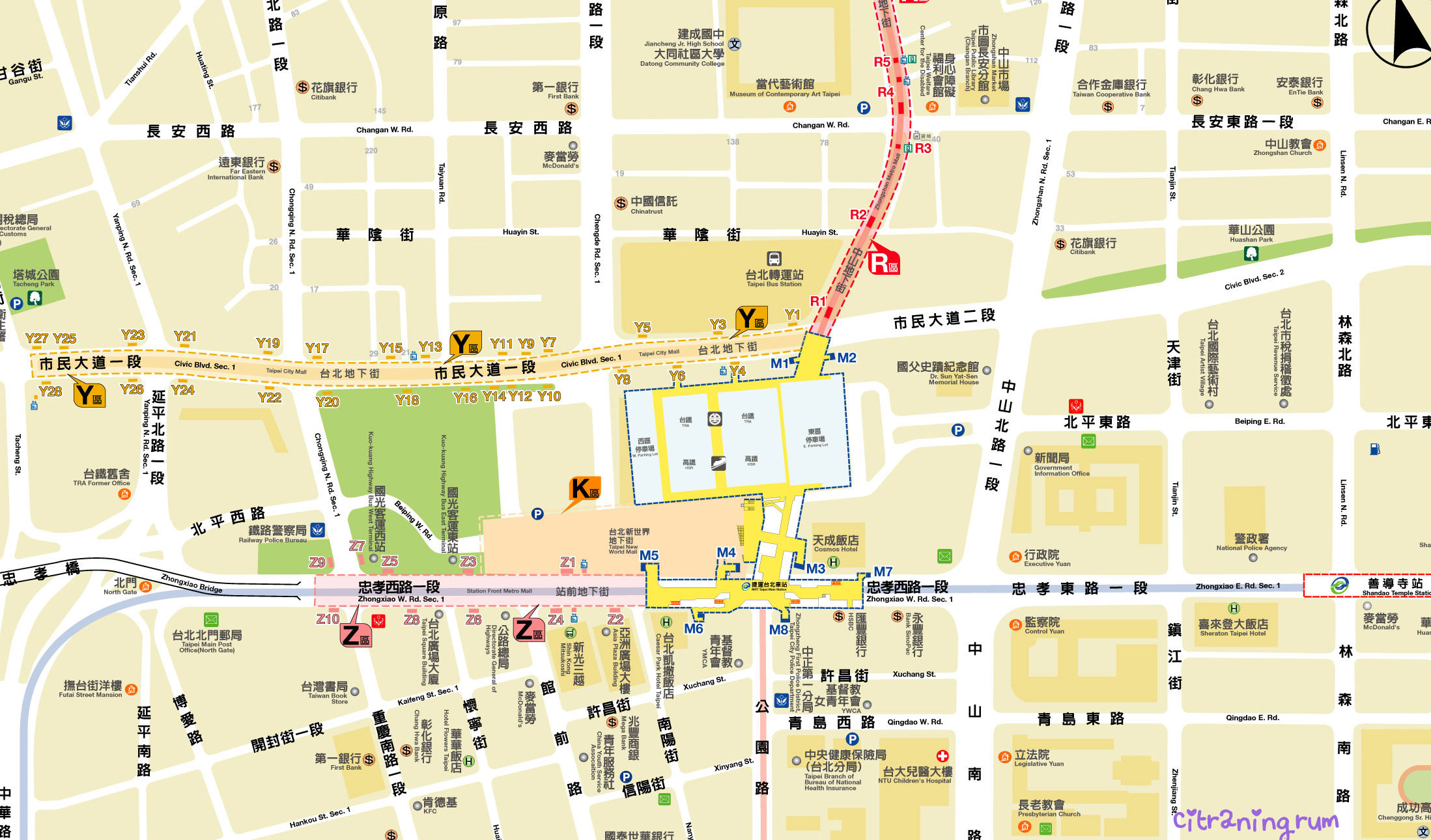 The Z Exits (plus Exits M3 – M8) open onto Zhongxiao West Road. Z Exits connect to an underground arcade called “Station Front Metro Mall”.