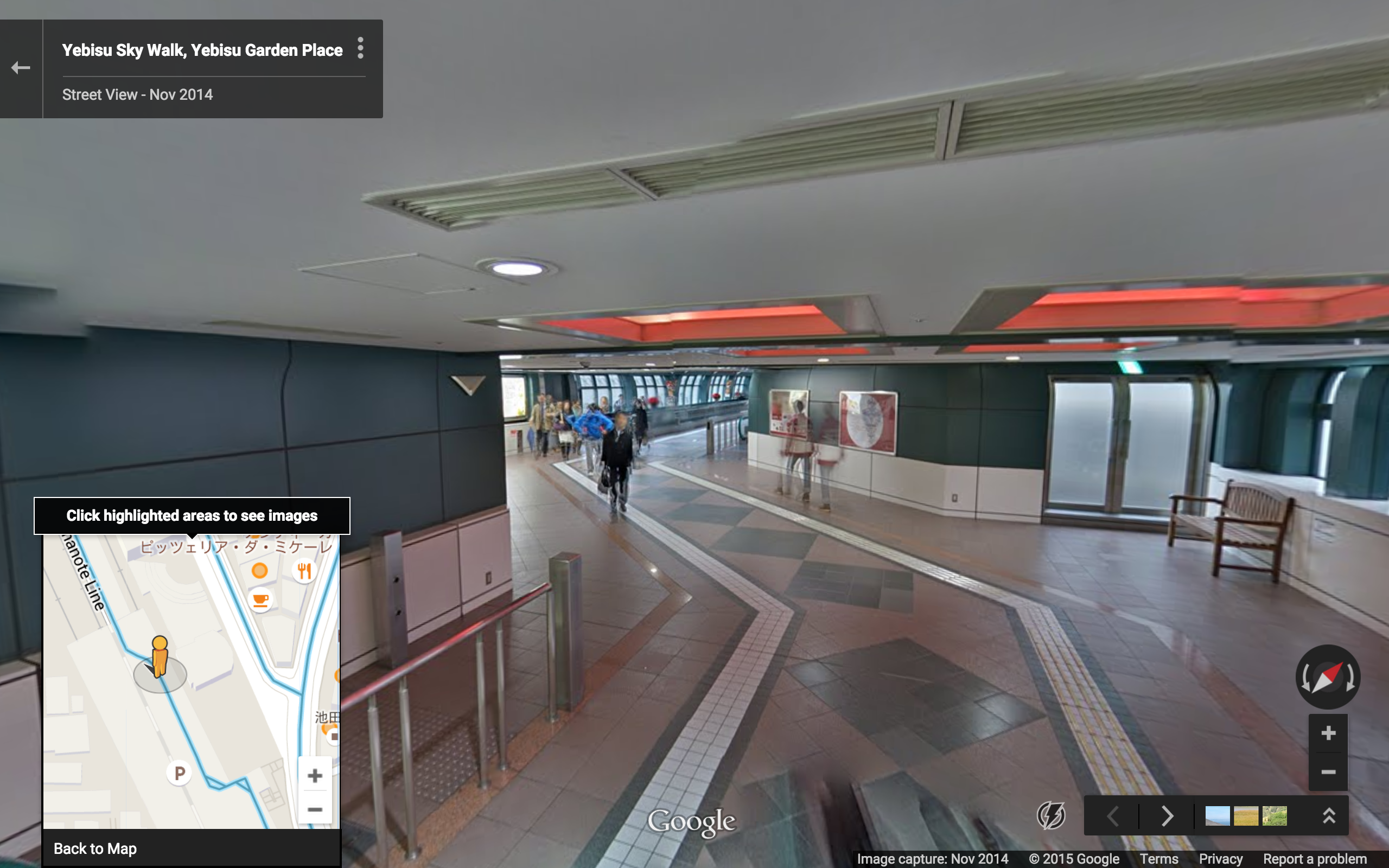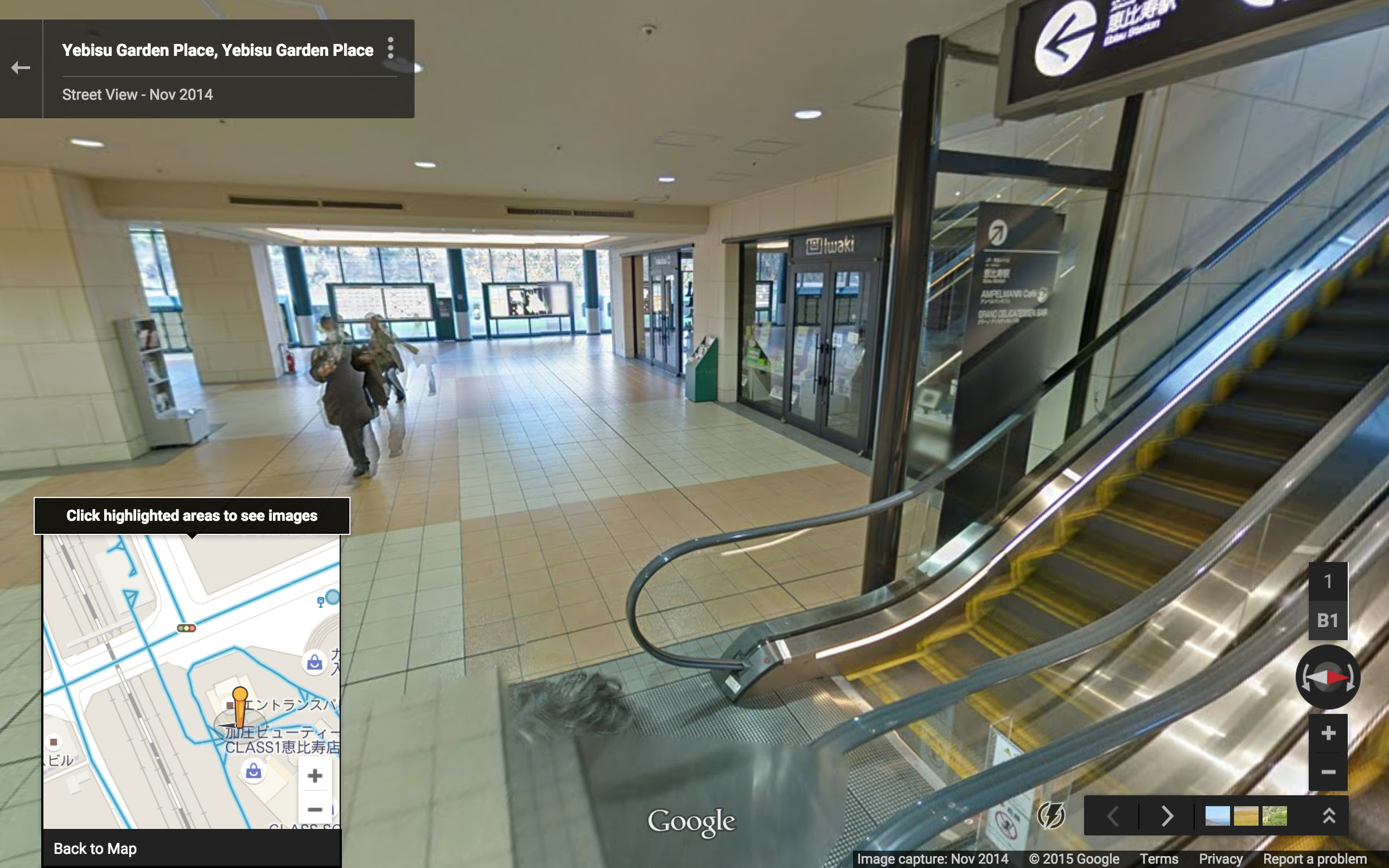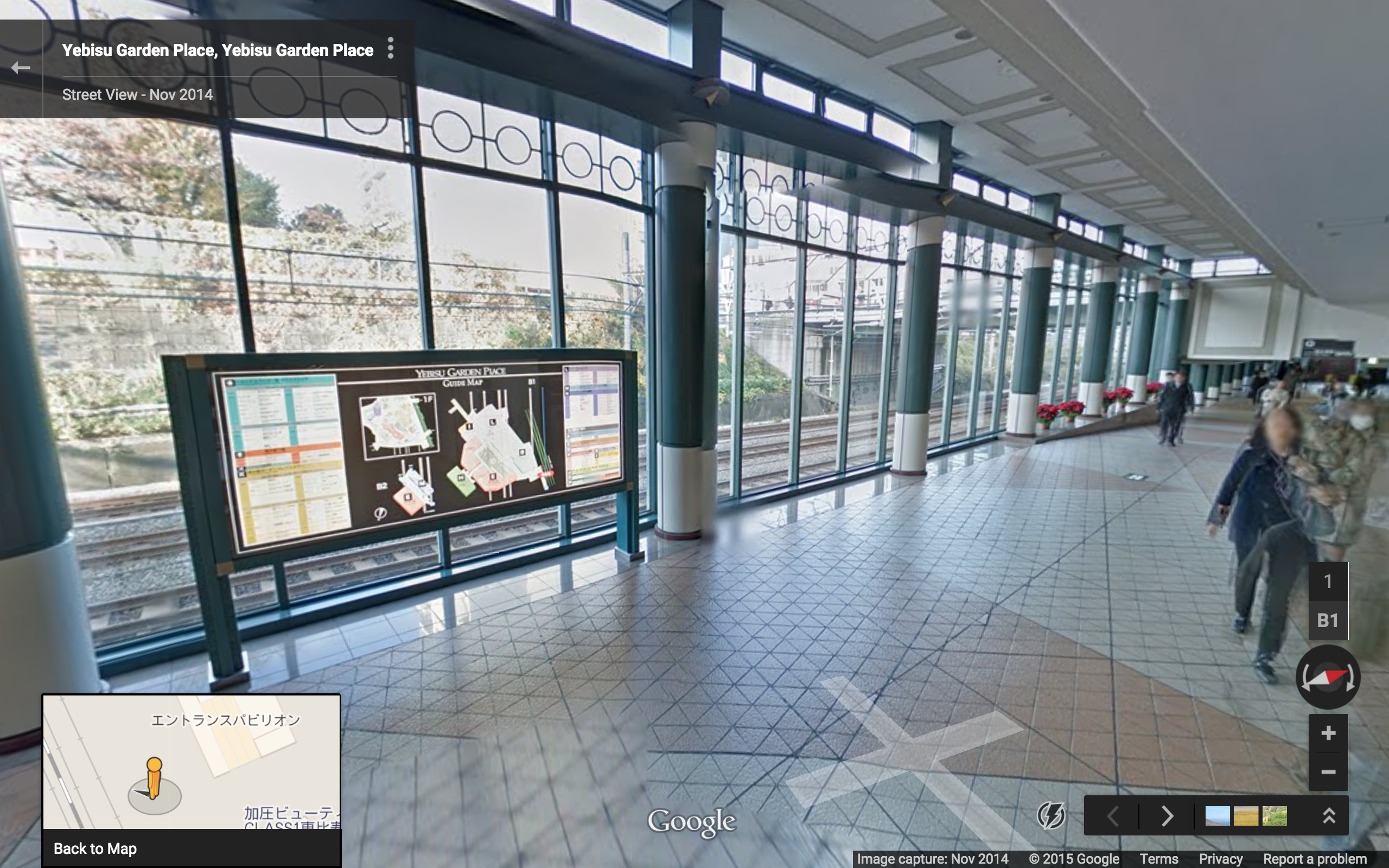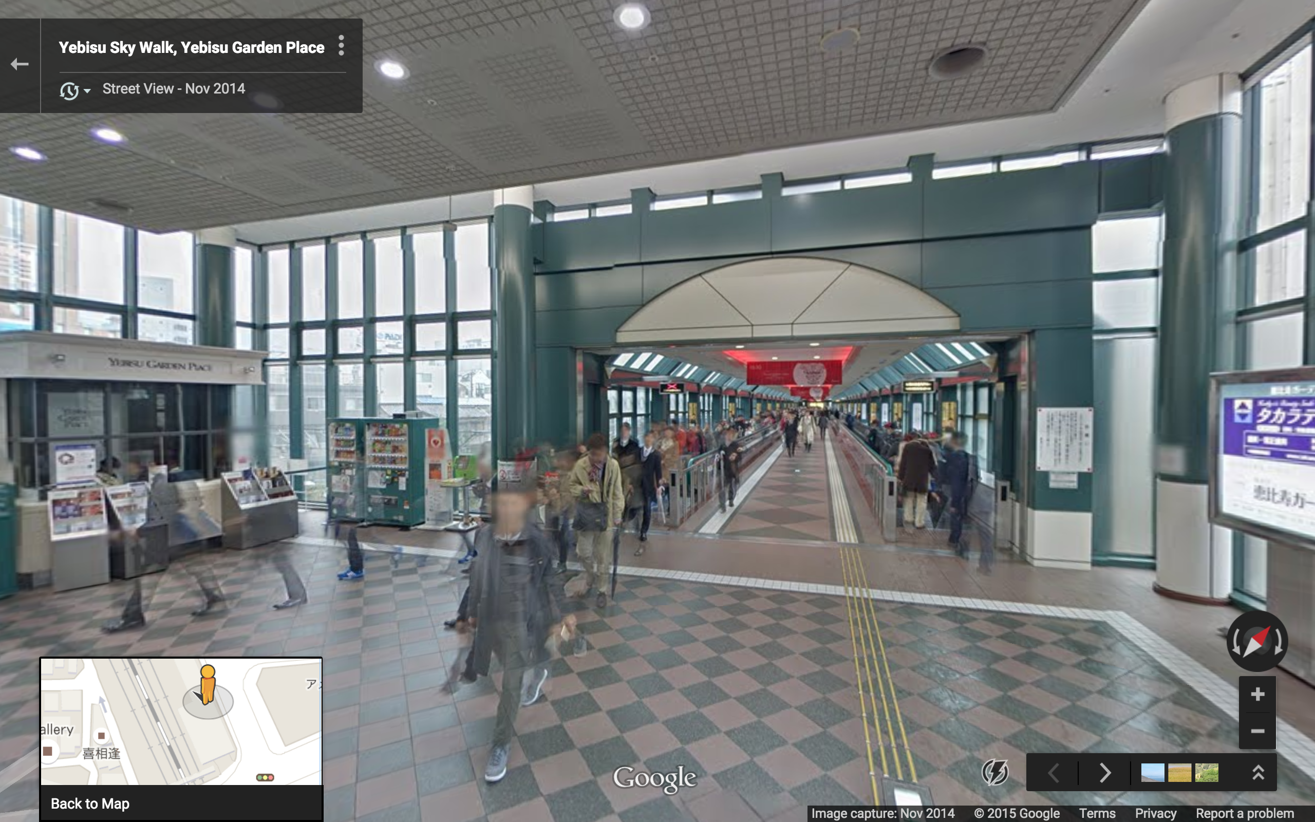 This tour starts in spectacular Ebisu Garden Place, spins around a bit to take in the view, and then proceeds north along the Ebisu Skywalk to Ebisu Station (JR Yamanote).