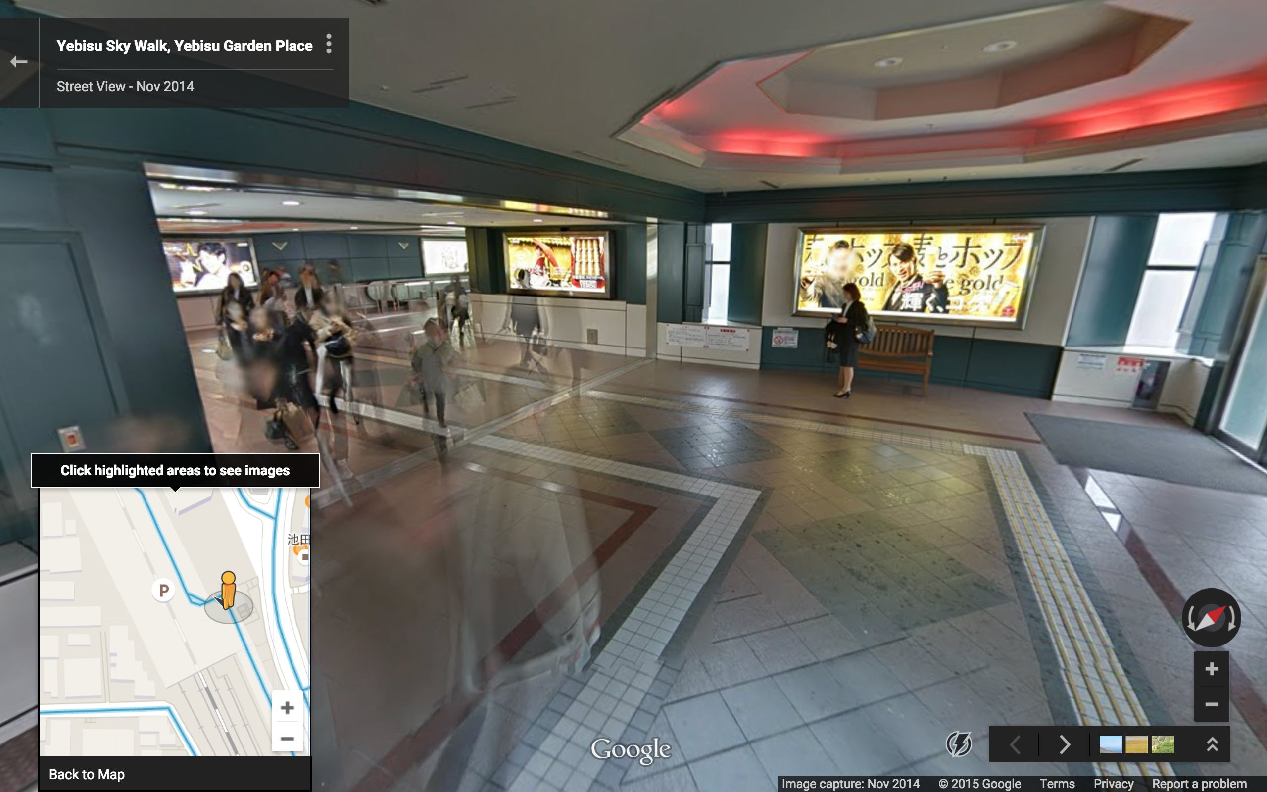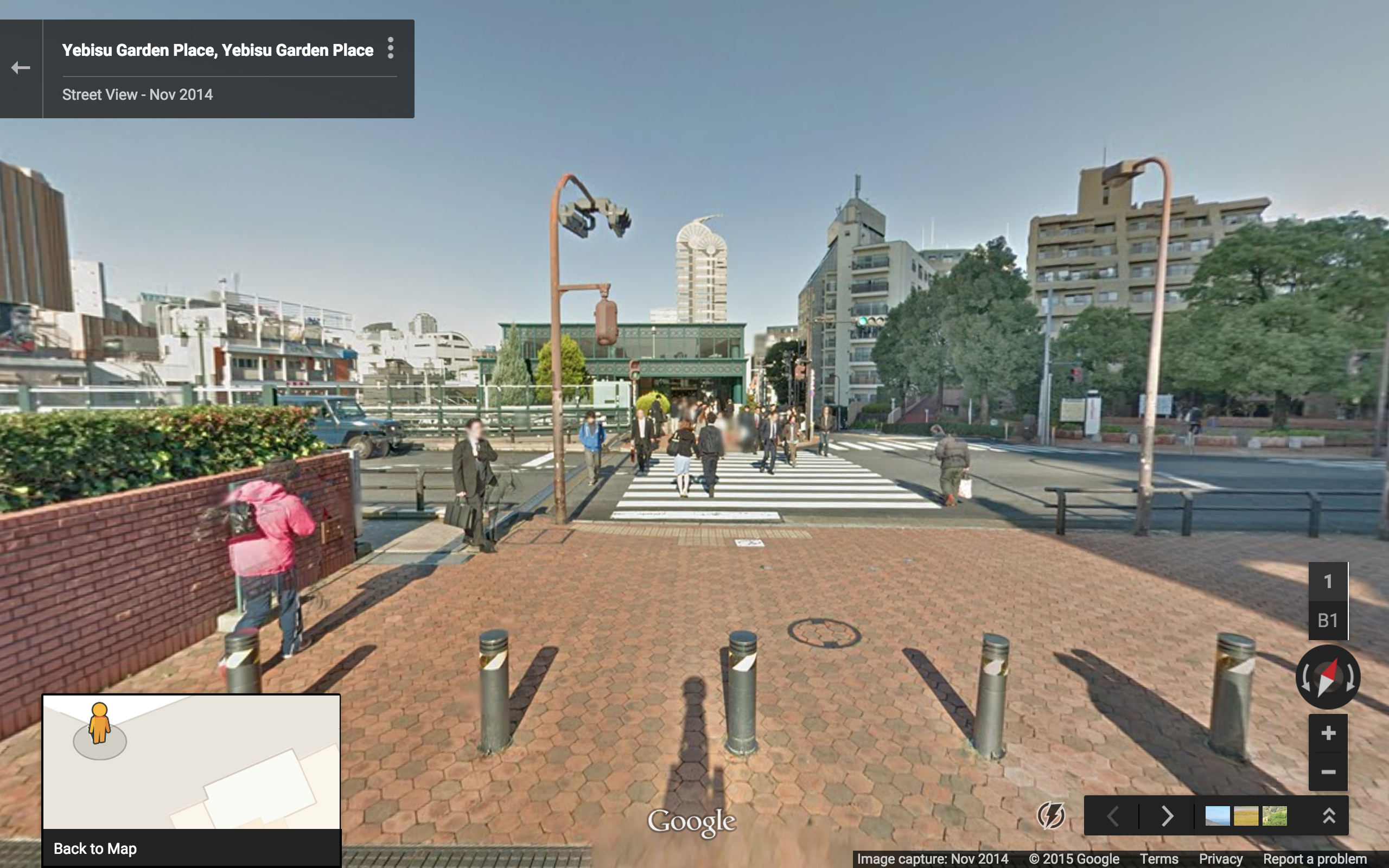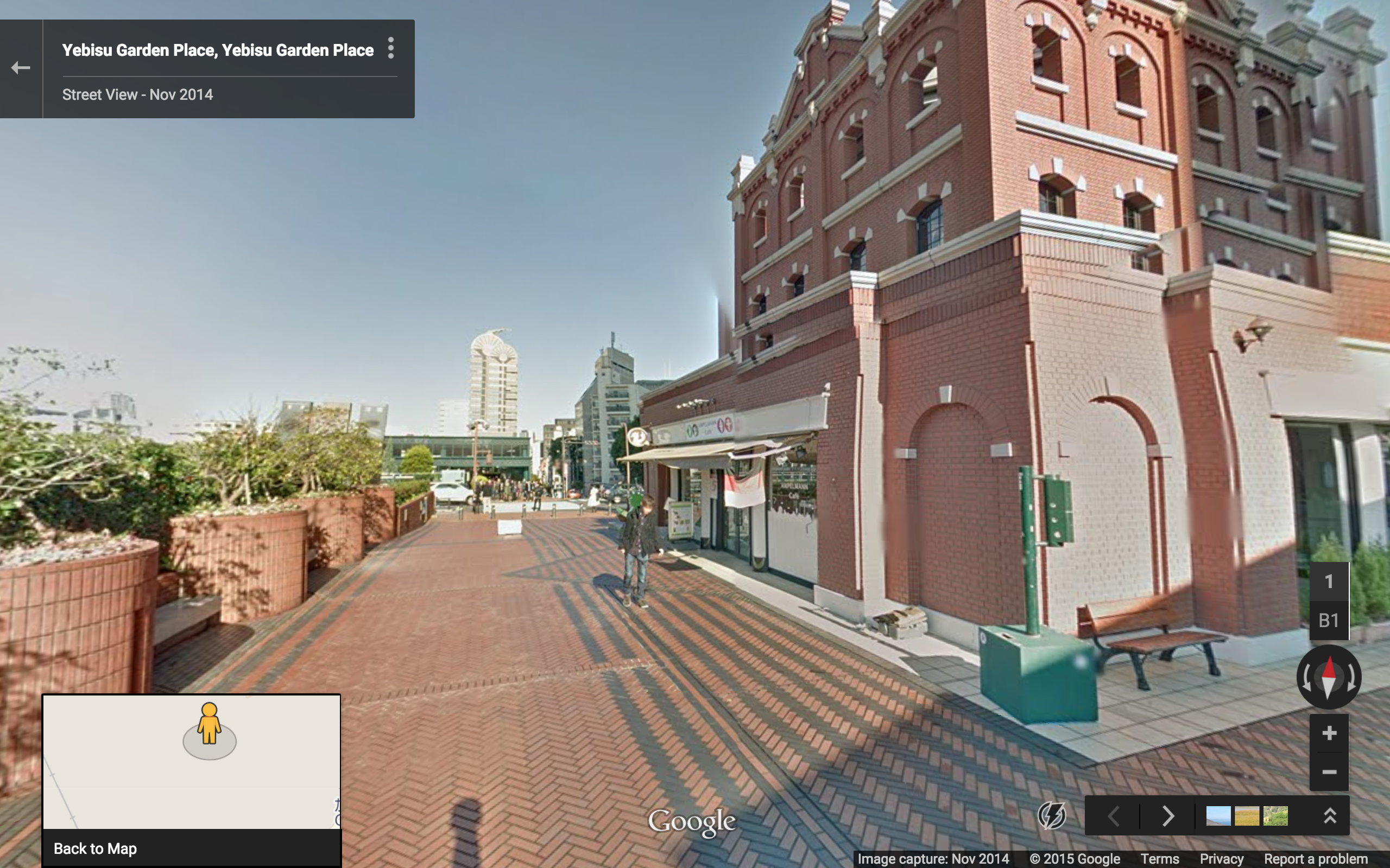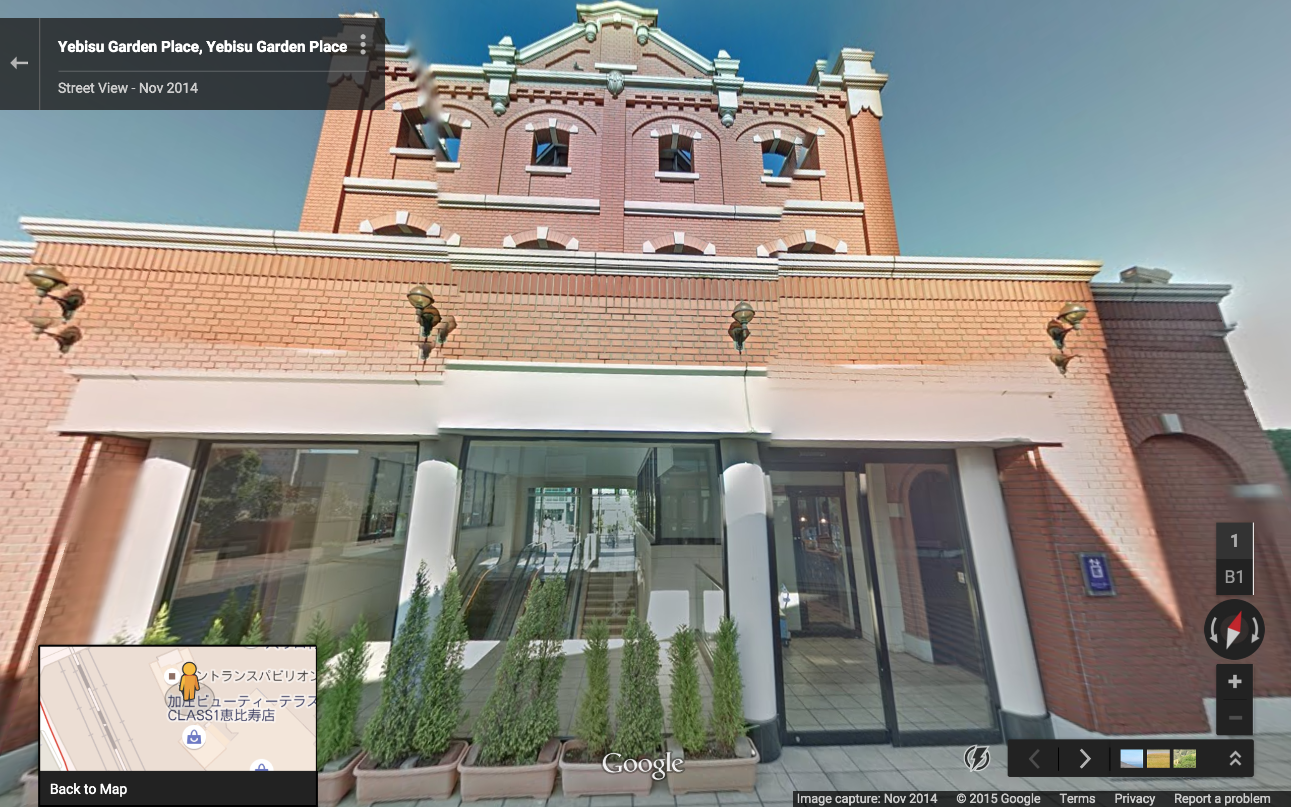 This tour starts in spectacular Ebisu Garden Place, spins around a bit to take in the view, and then proceeds north along the Ebisu Skywalk to Ebisu Station (JR Yamanote).