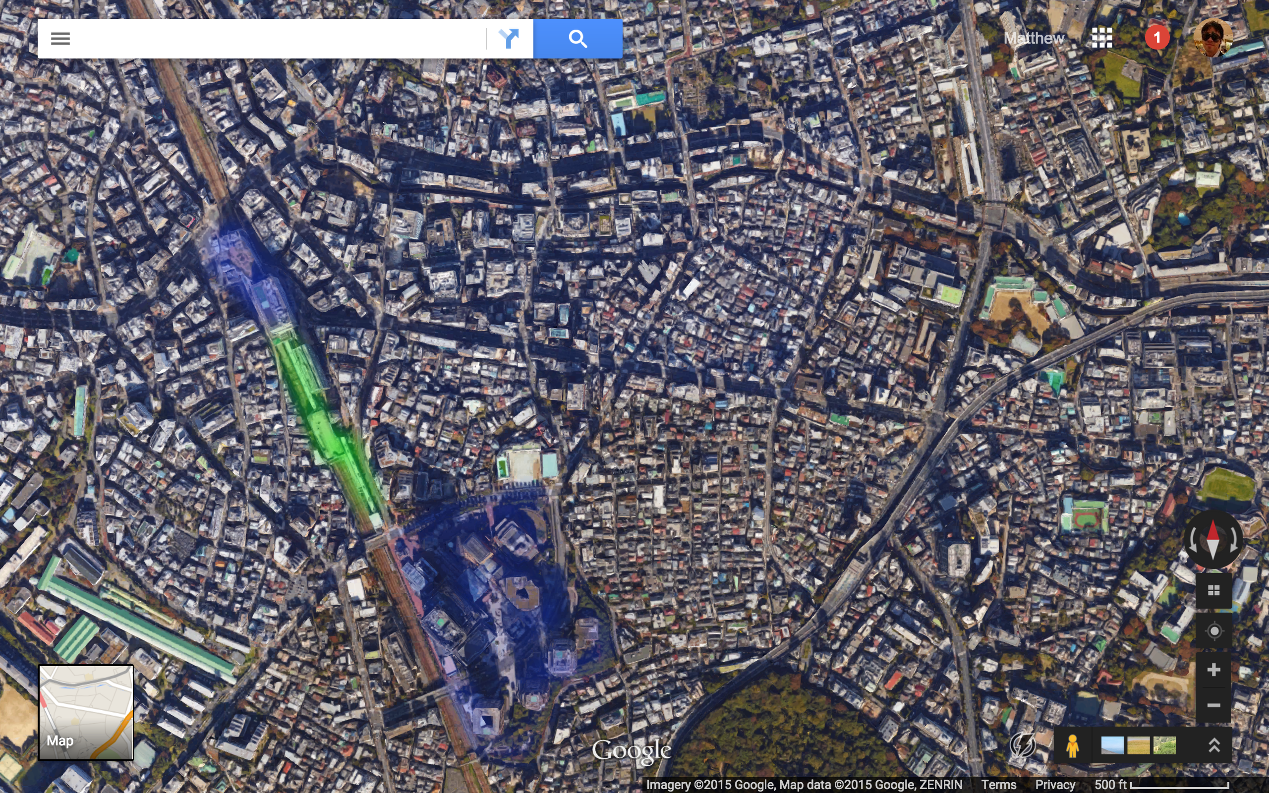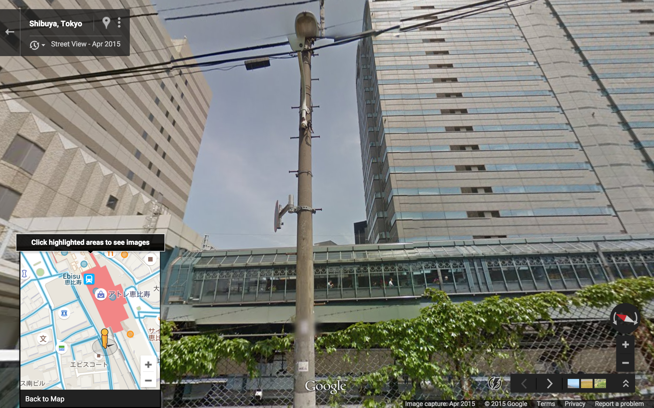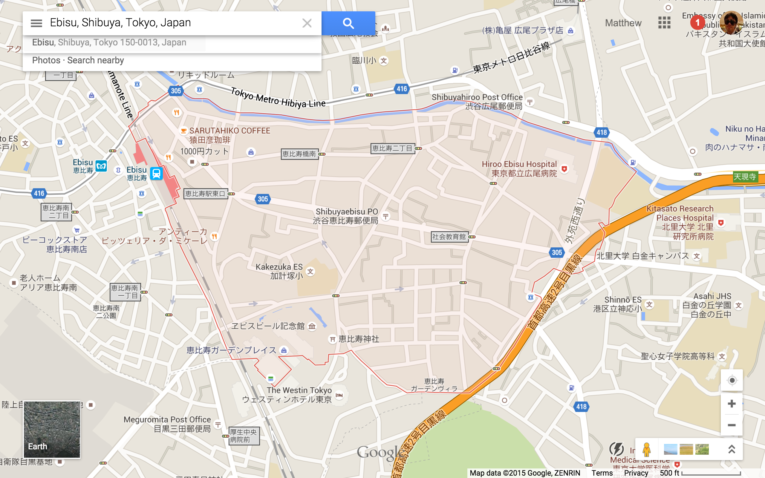 Ebisu Area Map. 500 foot scale. Note that Ebisu Station on the Hibiya line, as well as parts of the Ebisu Garden Place complex (e.g. the Garden Hall & The Westin Tokyo) are technically located in Meguro, not Ebisu.Satellite view of the same area. Ebisu Skywalk highlighted in green, JR Ebisu Station and Ebisu Garden Place complex highlighted in blue.