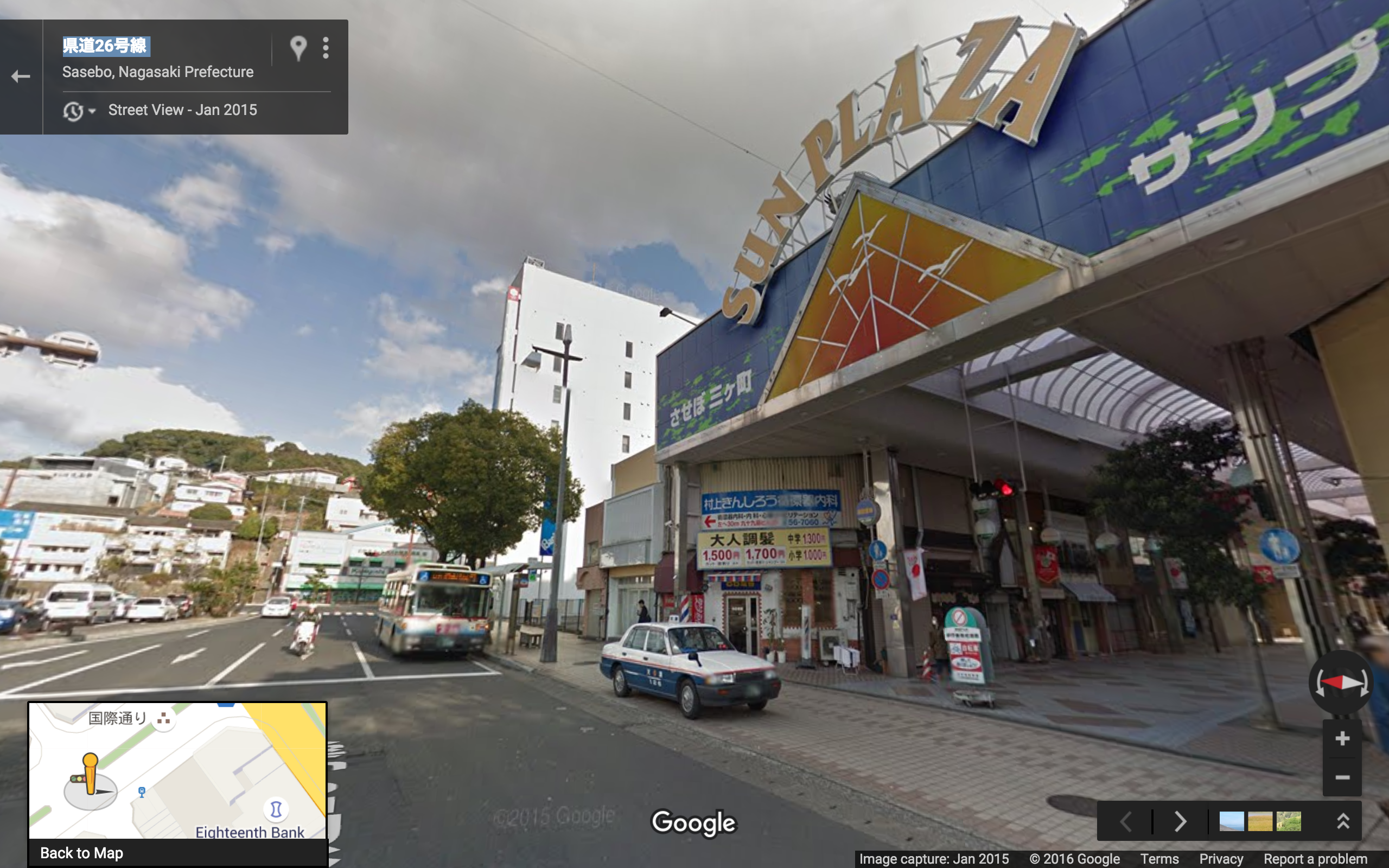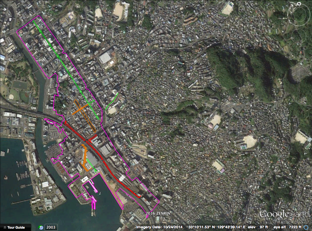 The following diagram shows downtown Sasebo on the left side: