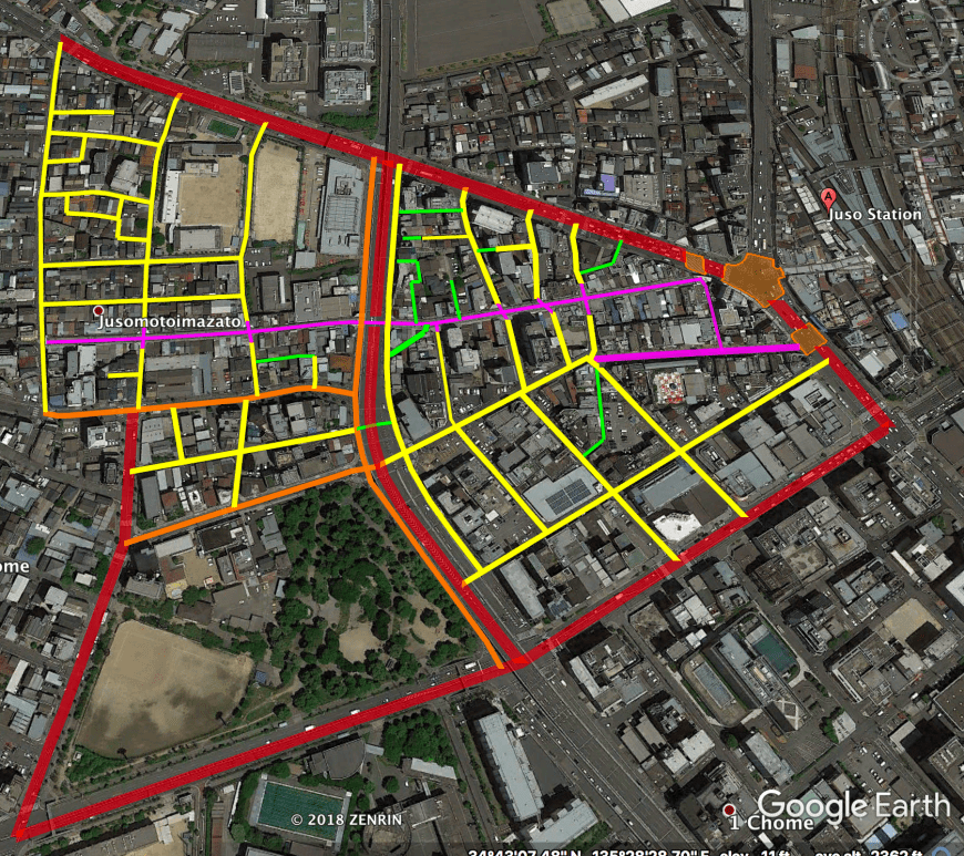 Green: covered arcades. Orange: slow street (curves have been deliberately added to street to slow traffic). Blue: underground halls and malls attached to subway stations. Stats: Length: 5,450′(from north end of arcade to south end of highlighted slow street). Spans roughly 1/2 the total width of Kobe (from the mountains to the sea). Change in elevation: 60′. The arcades running from Shinkaichi 3-chome to the Shin-Minato canal in Higashiyama-cho have … Continue reading Kobe: Shinkaichi & Shinsen-ichiba (新開地・新鮮市場)