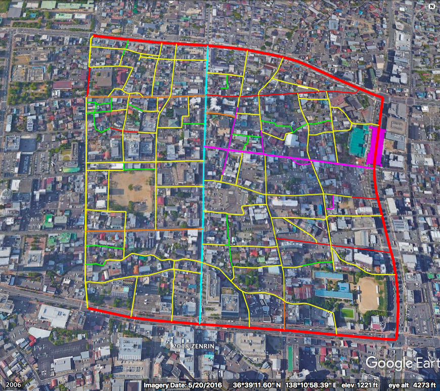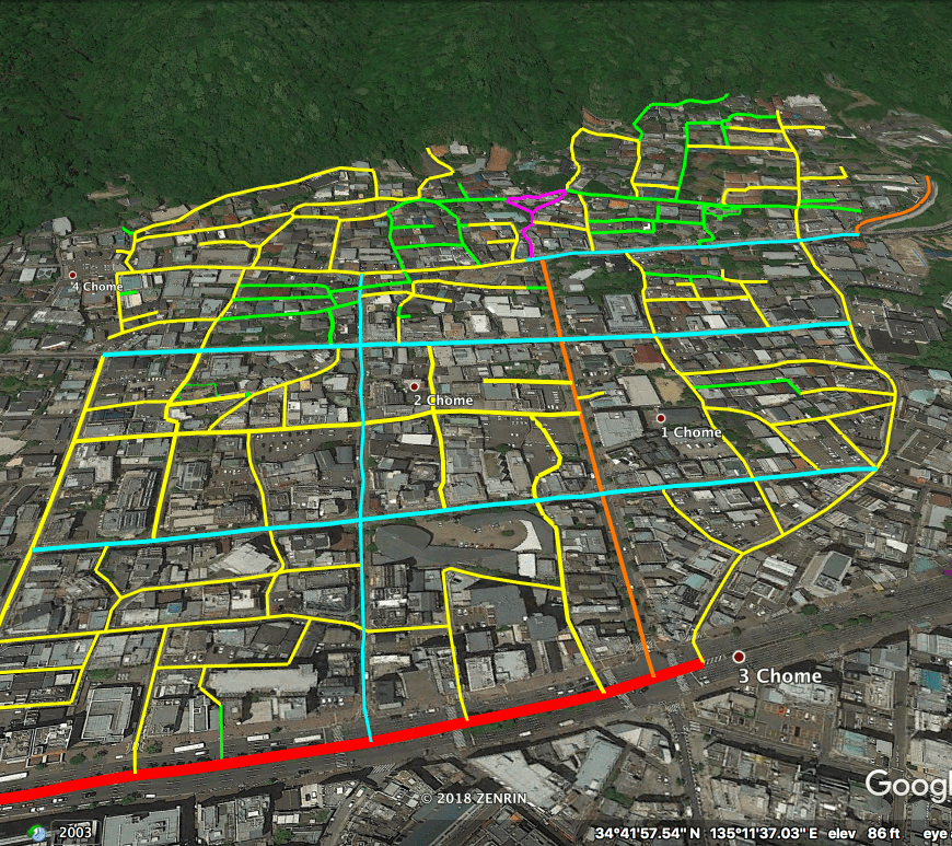 Analysis of the area NE of the Sannomiya Stations, around the Ninomiya Shotengai. Above: the highlighted area in the upper-left is the Kitano Ijinkan neighborhood. The highlighted area at the bottom is the subject area. The streets above are highlighted hierarchically as follows: – Magenta: Covered arcades and open-air shopping streets. – Red: “Busy” Boulevards. – Orange: … Continue reading Kobe Ninomiya Area